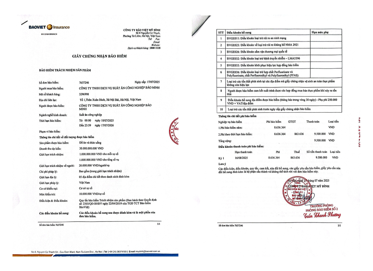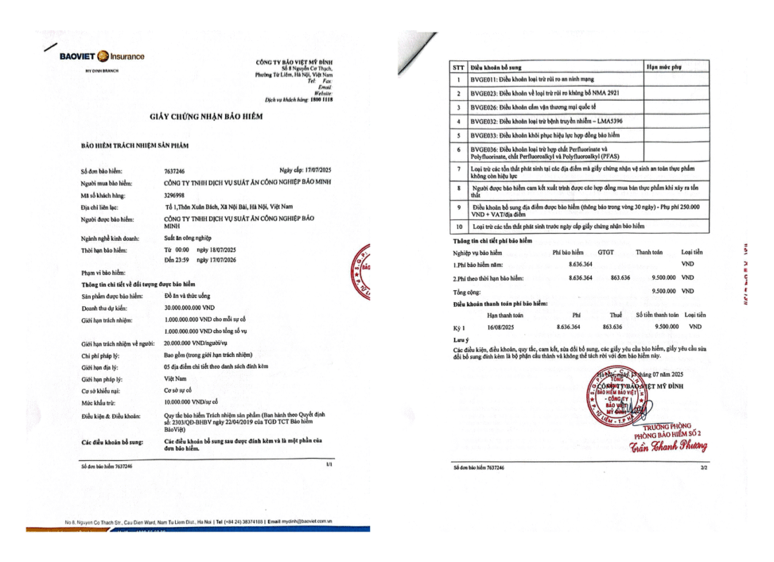 Mỗi suất ăn công nghiệp của Bảo Minh đều được bảo hiểm, cam kết đảm bảo an toàn vệ sinh thực phẩm và quyền lợi của người sử dụng. Chúng tôi áp dụng các tiêu chuẩn nghiêm ngặt từ khâu lựa chọn nguyên liệu, chế biến đến phân phối, giúp giảm thiểu rủi ro và mang lại sự an tâm tuyệt đối cho doanh nghiệp và nhân viên. Với hệ thống bảo hiểm từng suất ăn, chất lượng và uy tín dịch vụ luôn được duy trì, đồng thời góp phần nâng cao trách nhiệm của nhà cung cấp đối với khách hàng